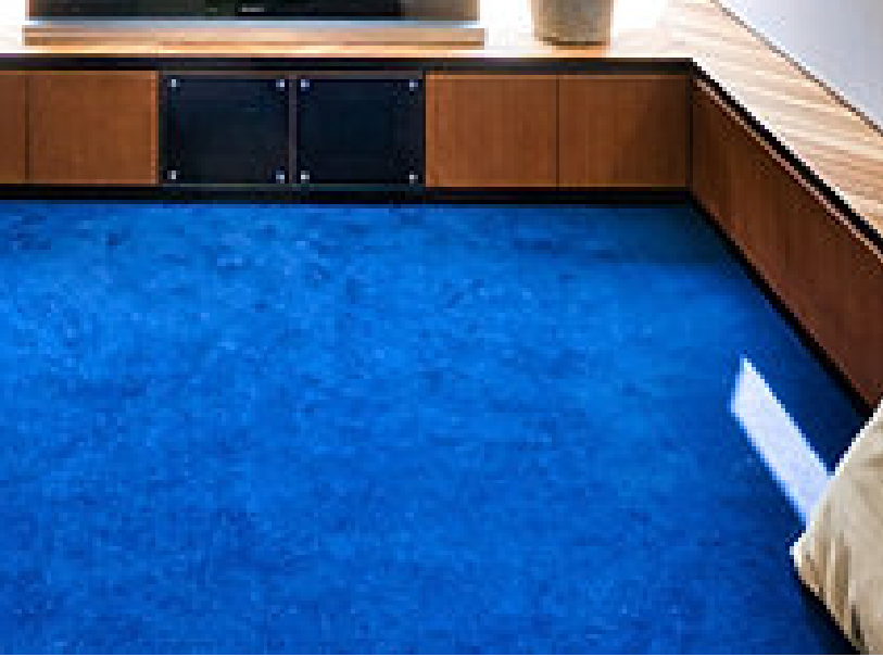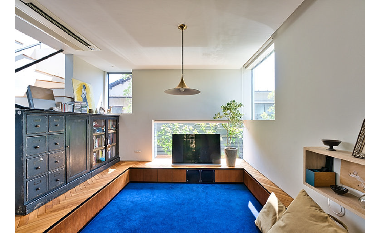 青い堀床のセカンドリビングは、視線が下がることで包まれ感が増し、より深くくつろげる空間に。