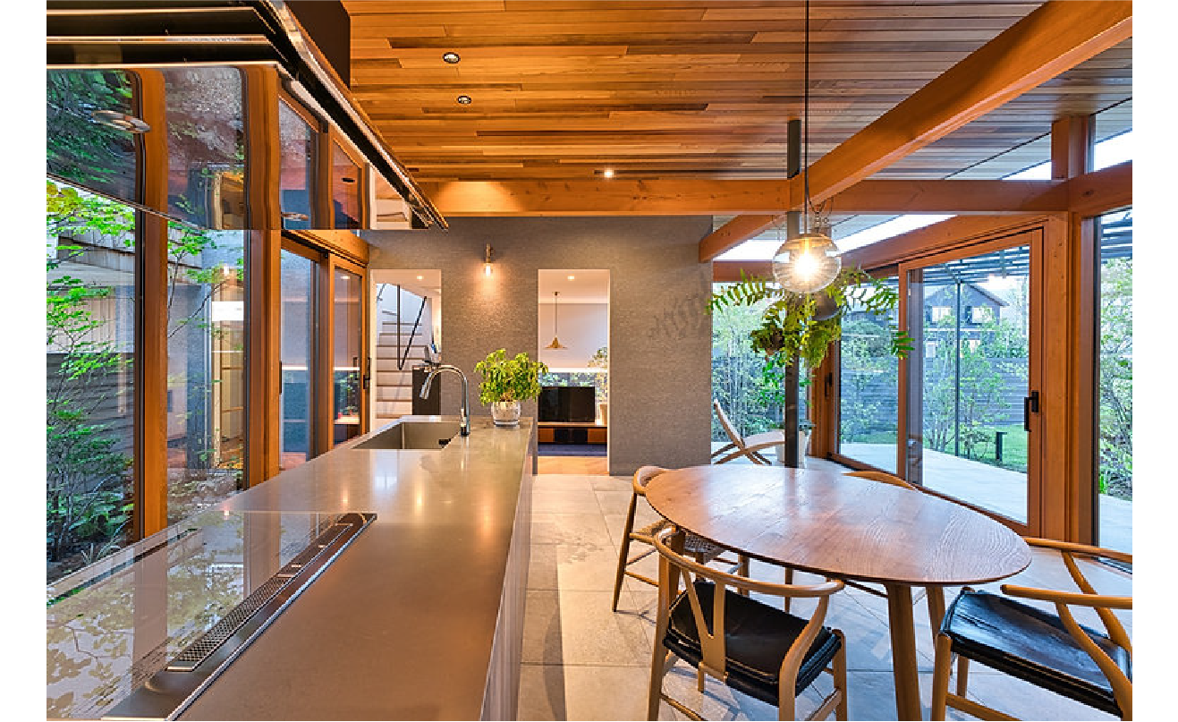 つい居座ってしまうような居心地の良いリビングと開かれたダイニング、そして雑木を育てる庭が溶け合うように構成された空間。すべてが“緑の中に暮らす”という感覚を、日常の中にそっと根づかせてくれます。