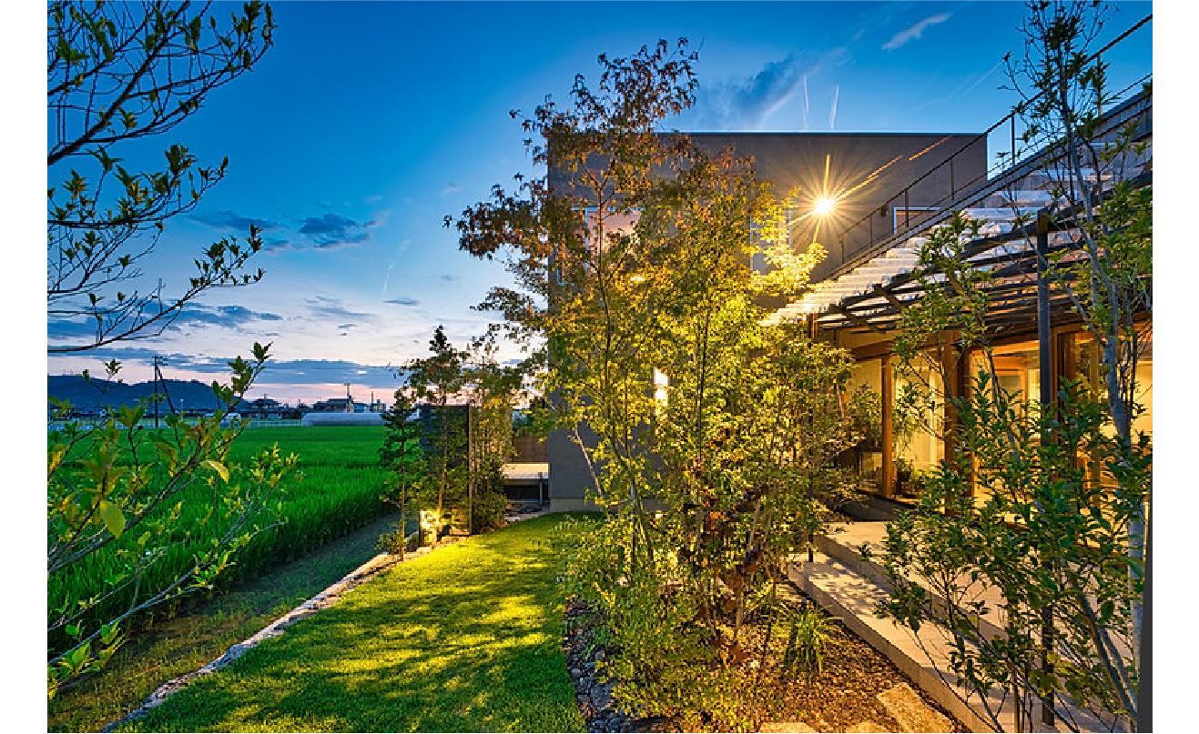 愛媛県松山市の郊外、奥に田園風景が広がり、夏には蛙の鳴き声が響くような静けさに包まれた土地に、4人家族の住む住宅が佇んでいます。