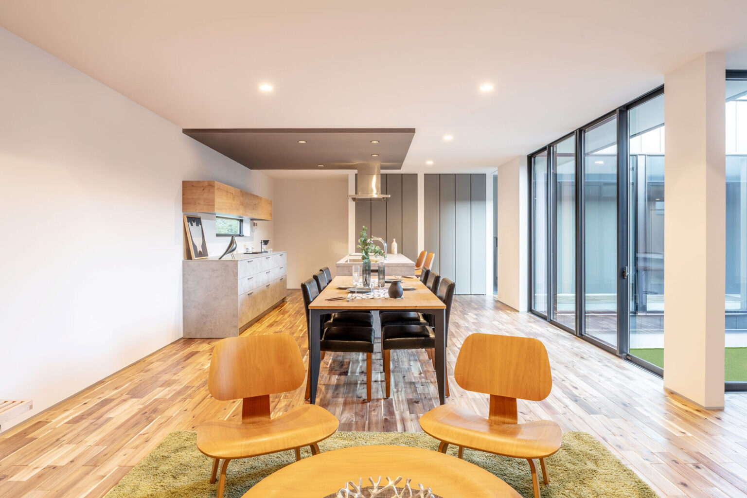 キッチンからは中庭越しにガレージやロフトの窓が見えるように設計しているので、個々の時間をたのしみながらも、完全に孤立しないようゆるやかなつながりをもたせ、まさに「スープの冷めない距離感」で、プライベートとつながりのバランスを保ちます。