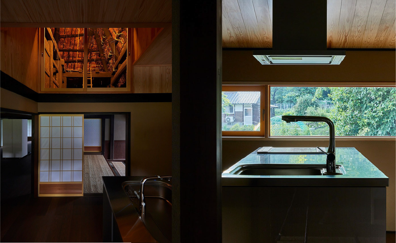キッチンからは、合掌造の梁組が視線の先に。古い建物の屋根裏は、温熱環境が厳しい。そこであえて距離を保ちつつ、ライトアップによって“鑑賞”する場として設計。空間に深みを与える構造の美しさが、日々の営みにそっと寄り添っているのです。