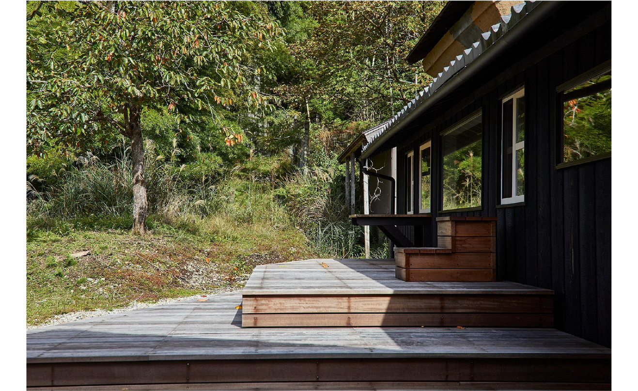 構造体は黒を重ね塗ることで古材の質感を整え、素材そのものがもつ時間の深みを活かしています。
