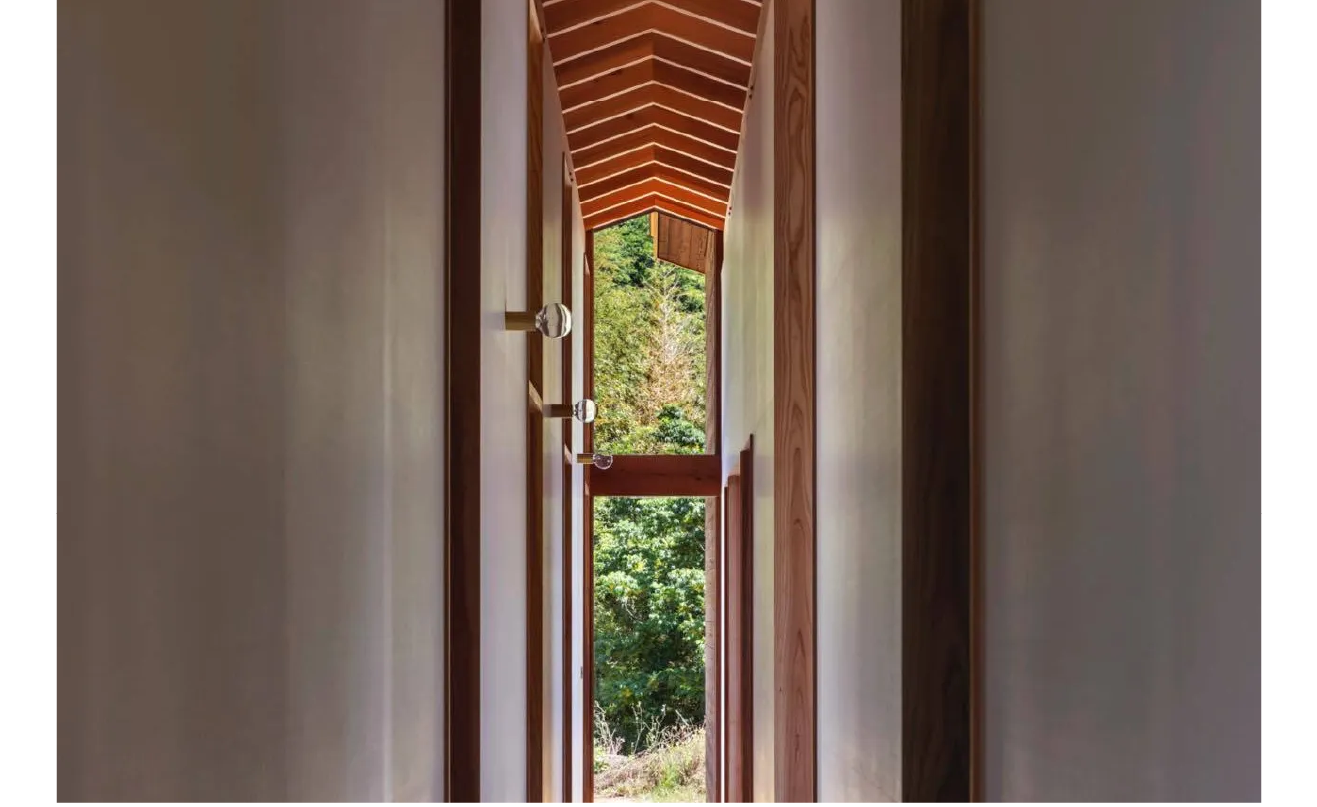 特筆すべきは天井高3.5mの廊下の突き当たり。壁の代わりにガラス面にすることで視線の抜けをつくり、季節ごとに表情を変える緑を取り込んでいます。空間の緊張をやわらげ、呼吸のようなリズムが生まれることで自然との対話を象徴する場所となっています。