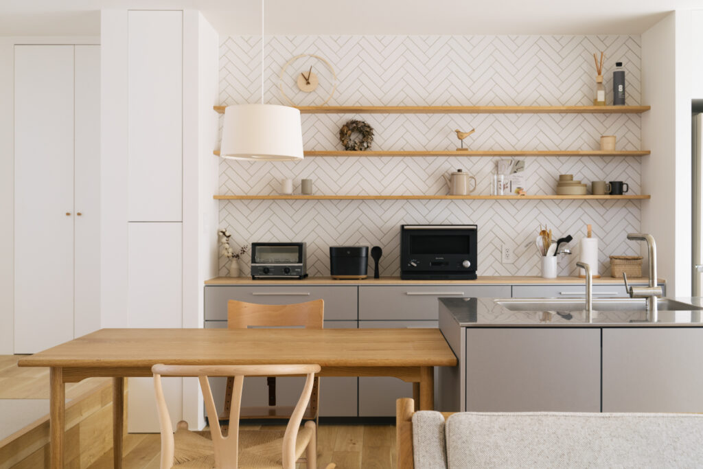 背面収納はオープンな棚板とし、収納のラインを水平に揃えることで、すっきりとした美しさが際立つデザインに。器や道具はひとつひとつ丁寧に選ばれ、余白を意識したディスプレイのように整えられています。ヘリンボーンのタイルなど、細部にまで素材へのこだわりが表れています。
