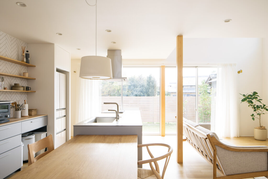 木と白を基調としたナチュラルモダンな内装で、柱や家具には天然木を、フローリングにはオーク突板を採用するなど、素材感を大切にしています。