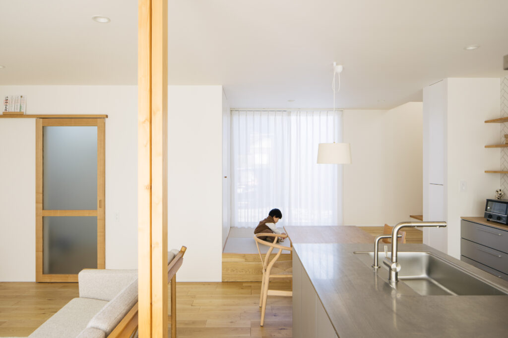 一方で、デザインだけでなく、機能性にも配慮されています。LDKはキッチン・ダイニング・リビングが一体となったワンルーム空間で、料理をしながらでもお子さまの様子がうかがえます。さらに、キッチン横には小さな畳スペースを設け、段差によってさりげなくゾーニング。お子さまが遊んだり、奥さまがヨガを楽しんだりと、家族それぞれが心地よく過ごせる工夫を施しています。