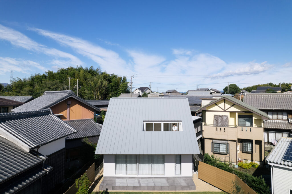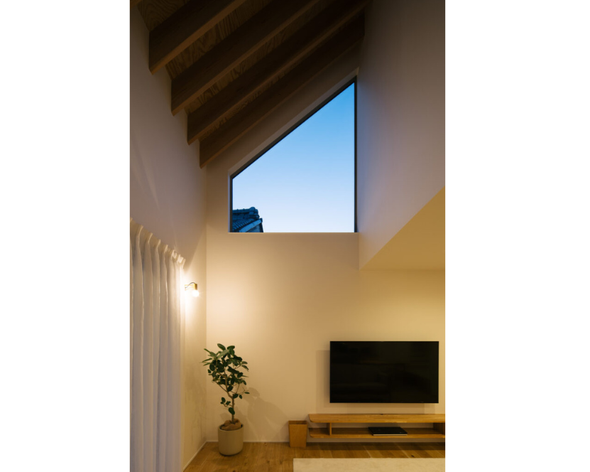 リビングに設けた台形の額縁窓からは、隣家の屋根越しに空や月が望め、日常の中でふと空を見上げるきっかけをつくってくれます。朝の光に包まれながら静かにコーヒーを淹れる時間、日が暮れていく時間など、何気ない日常の中に小さな幸せが積み重なる住まいです。