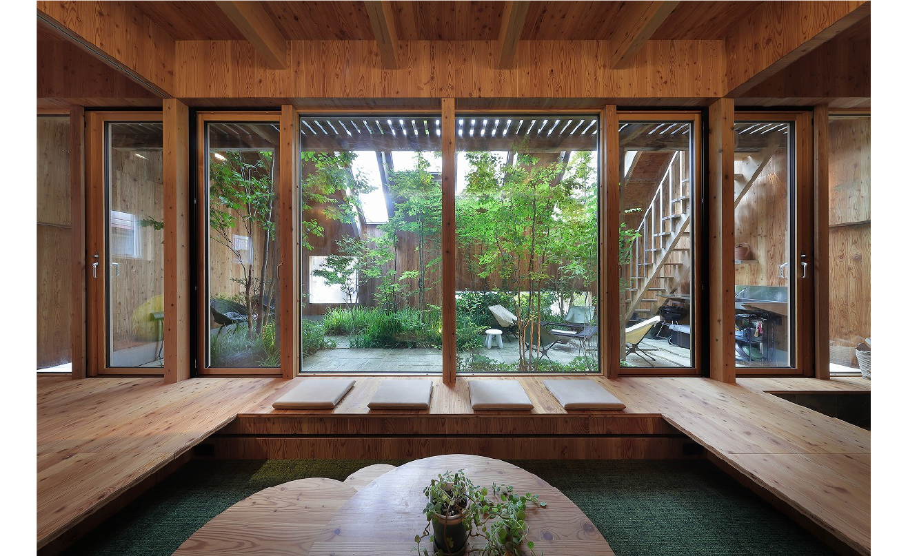 中庭には屋根がかかり、緑の間を縫って差し込む木漏れ日がやわらかい陽だまりを作り出します。