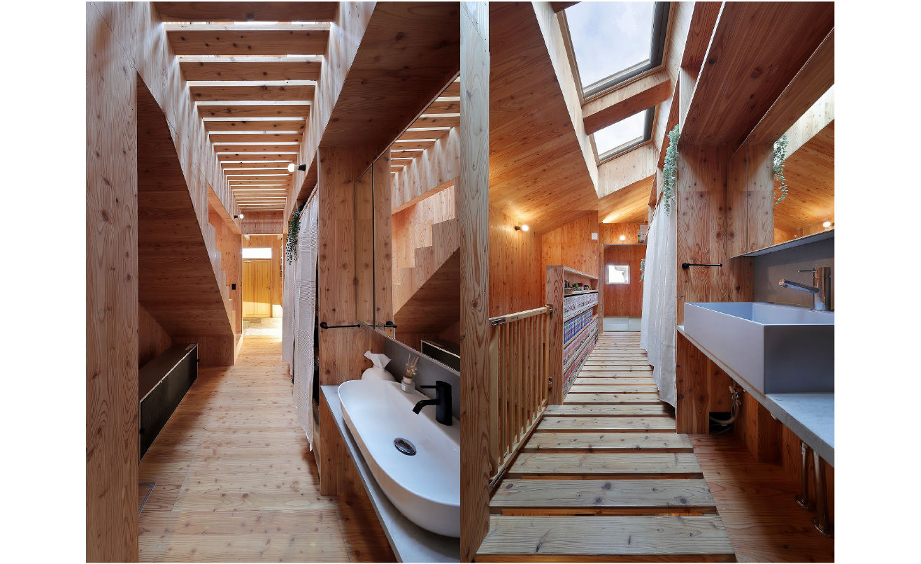 住まいの主空間となるのは2階。勾配45度の屋根と大開口により、光や風が上下に巡る高さ方向の広がりが印象的です。階段上部には天窓とスノコ状の床が設けられ、そこから柔らかな光が1階まで通る構成。