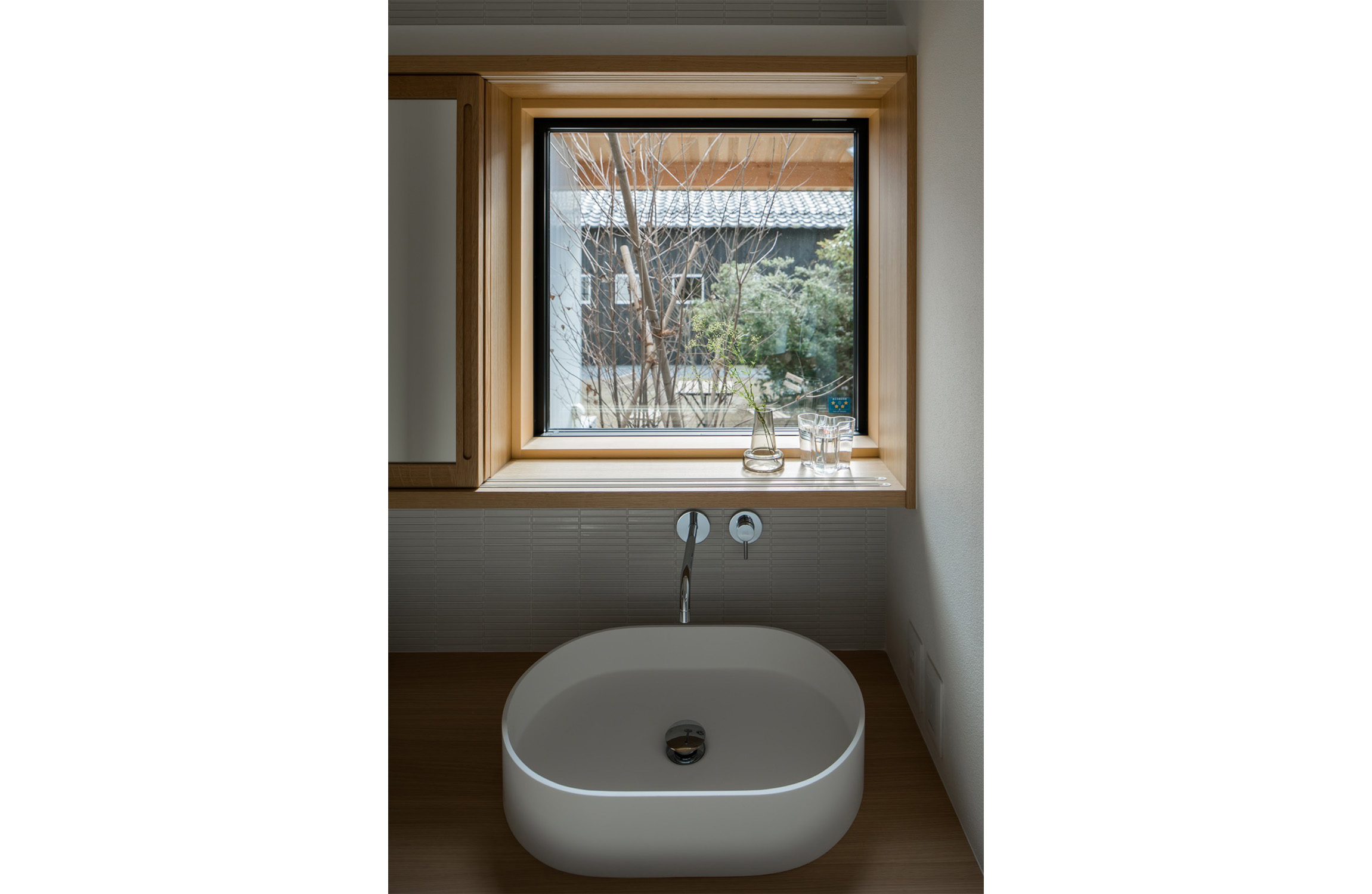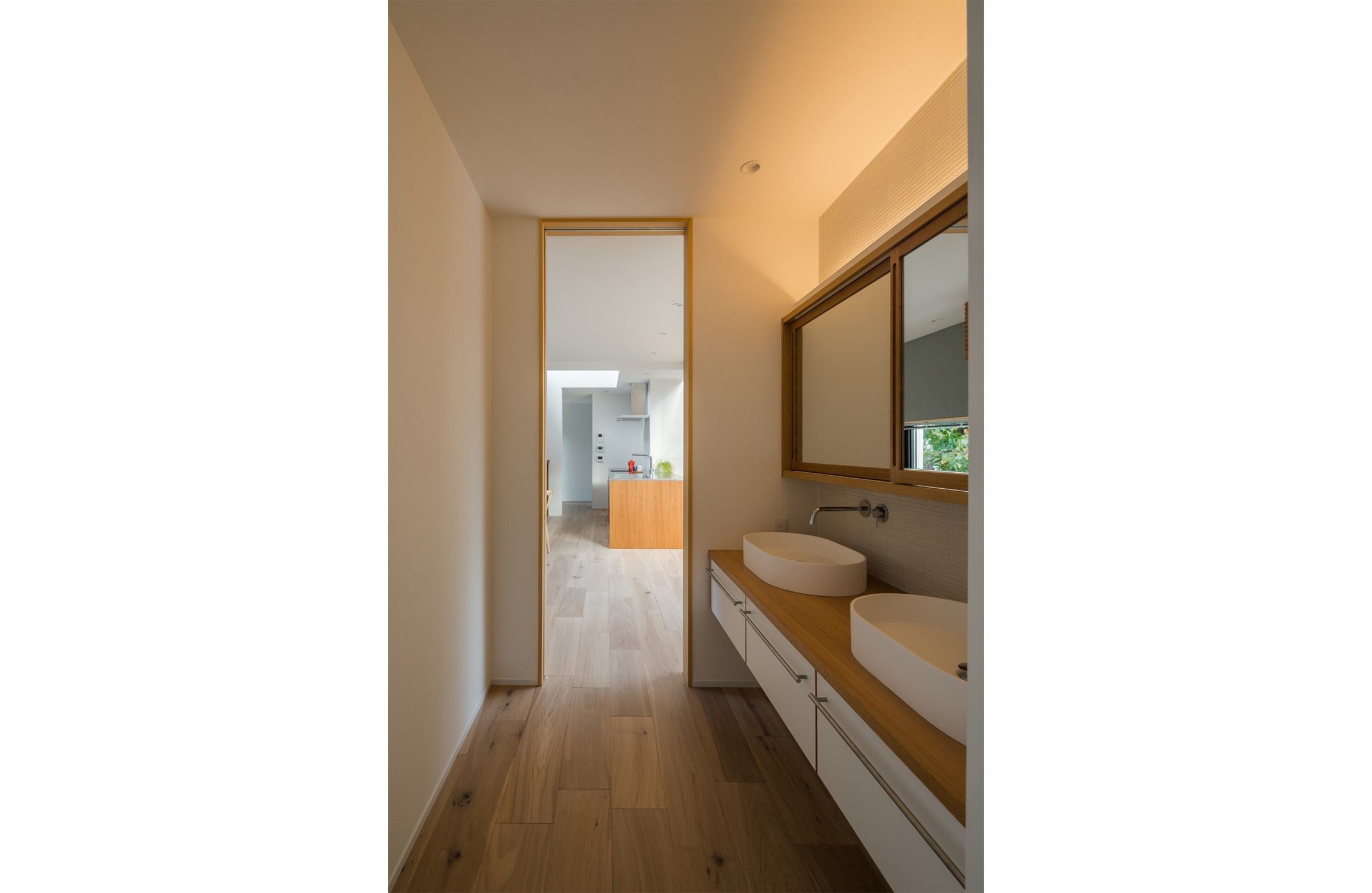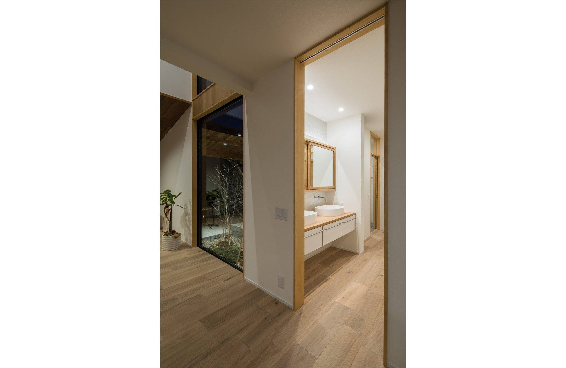 リビングから浴室やトイレの水廻りへの動線にあたる廊下に洗面を配置しました。ダブルボウルで家族が混み合う時間も安心して利用できます。ミラーをスライドすると中庭の緑へ視線が抜けて気持ちがいい空間に。夜はライトアップした中庭も洗面から楽しめます。独立した洗面室にせず廊下を少し広げて配置することでスペースを有効活用できます。