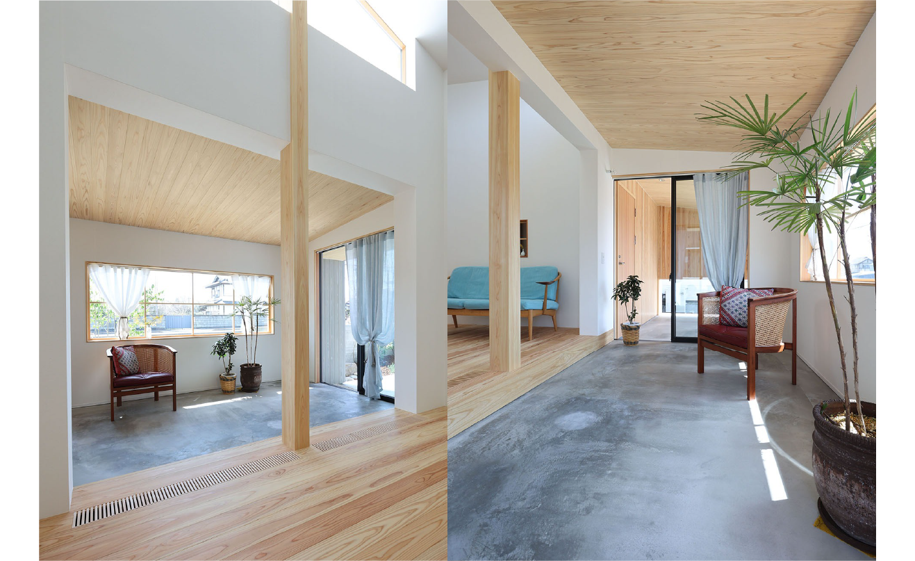 そして勾配天井で高さを確保したリビングの前にひらかれた土間空間。コンクリート仕上げの土間は庭のような性格を持ち、外と内のあわいとして暮らしに多彩な表情をもたらしています。