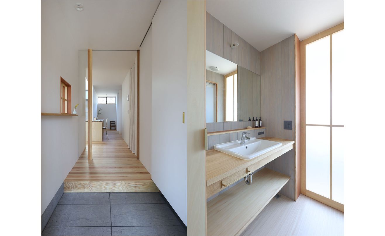 素材には、杉の床、ヒノキの柱、和紙貼りの壁を使用。手が触れる場所ほど自然素材の心地よさが生き、調湿性や光の反射によって室内にやわらかな空気を生み出しています。