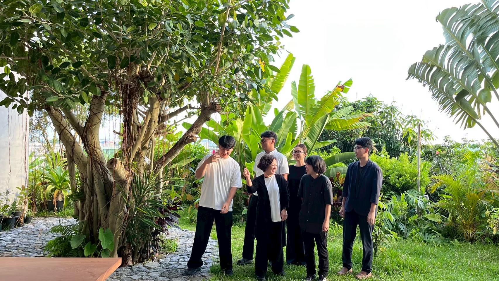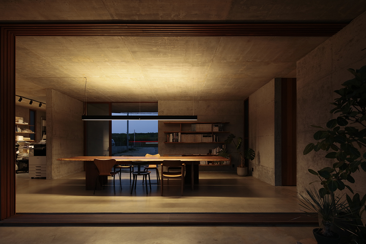 3つの箱の中央には、壁ではなく窓を介して風が通り抜ける空間が設けられています。この“風の間”は特定の用途に縛られず、リビングやダイニング、打ち合わせスペースなど多目的に利用できる自由度の高い場。南を向いたこのスペースは、太陽の動きや風向きを考慮し、季節や時間帯に応じて快適さを保つ設計となっています。