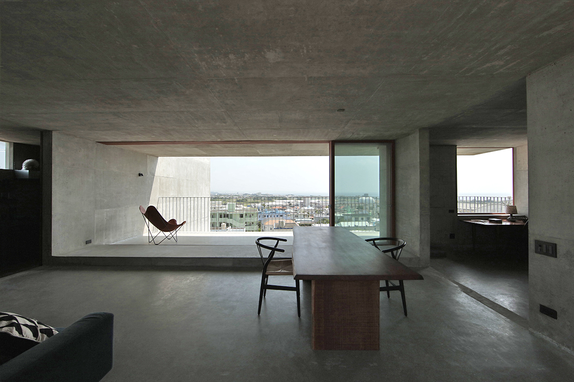 沖縄の住宅街に建つRC造の住まいは、大きく三つの箱で構成されています。細長い棟には水回りを集約し、左のボリュームは1階が事務所、2・3階が居住スペース。もう1つのボリュームには階段や倉庫を配置し、それぞれの機能を明快に分けた構成です。
