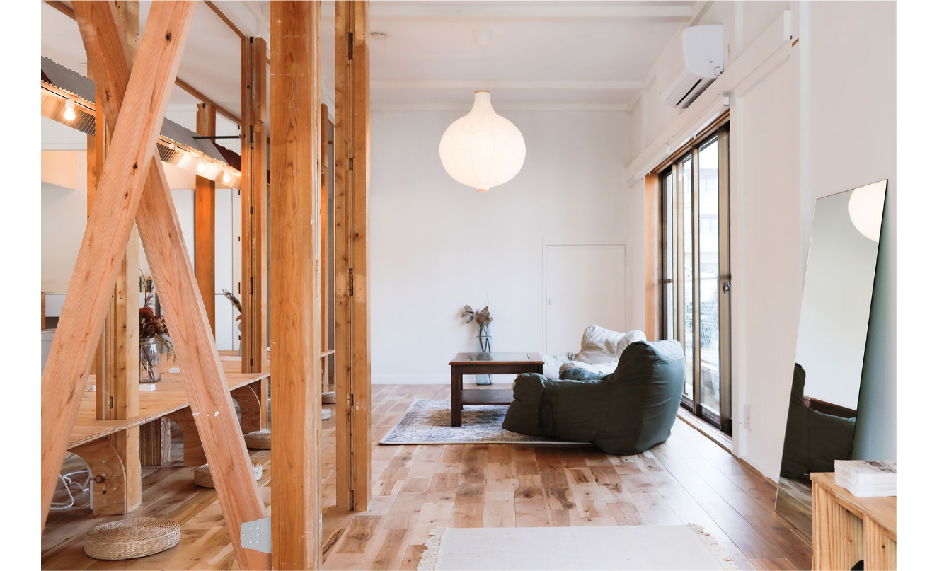 家具は既製品を中心にシンプルに揃え、造作でつくり込む部分とバランスをとりながらローコストを実現。余白を残した構成が空間に柔軟さを与えています。