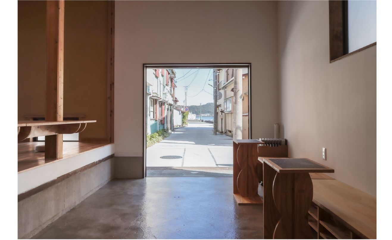 下田の街並みと呼応するラフな素材感が地域の風景を室内に映し込んでいます。