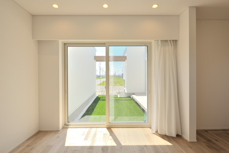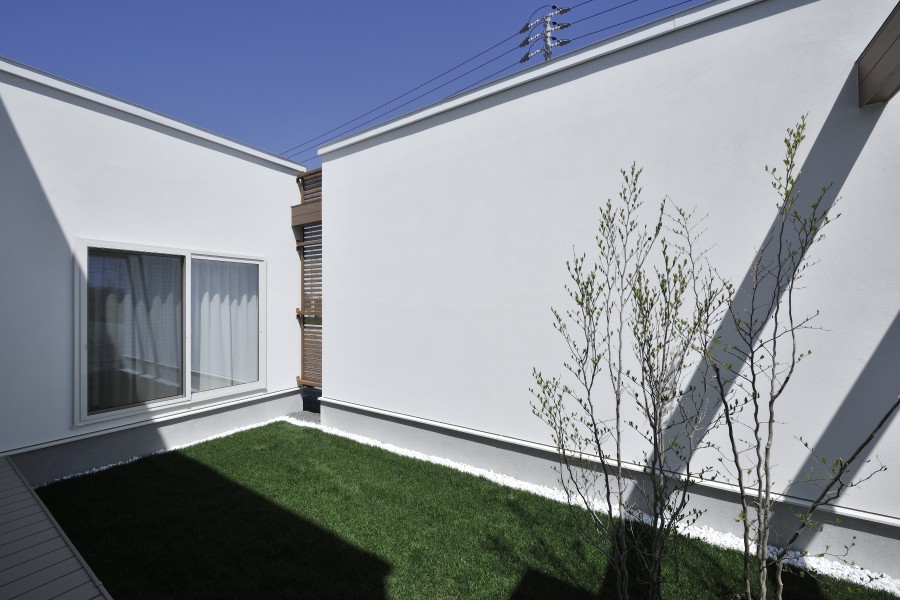 そこで採用したのが、庭をぐるりと囲う白い壁です。この白い壁は目隠しの役割だけでなく、時間を映し出すキャンバスとなります。