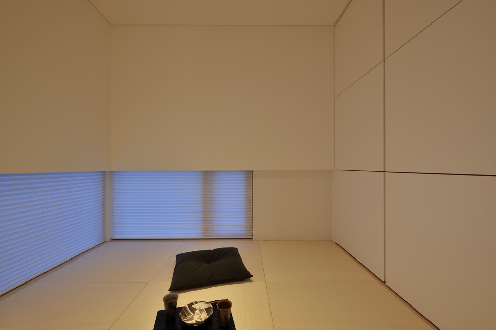 天井高2.4mを三等分し、そのラインに合わせて窓の高さや壁収納、畳の割り付けを揃えることで、空間全体にモダンな整然さを与えました。壁一面に設けた大きな収納は、あえてラインを強調するデザインに。のっぺりとしがちな白壁にリズムと奥行きを与え、空間に表情をもたらしています。