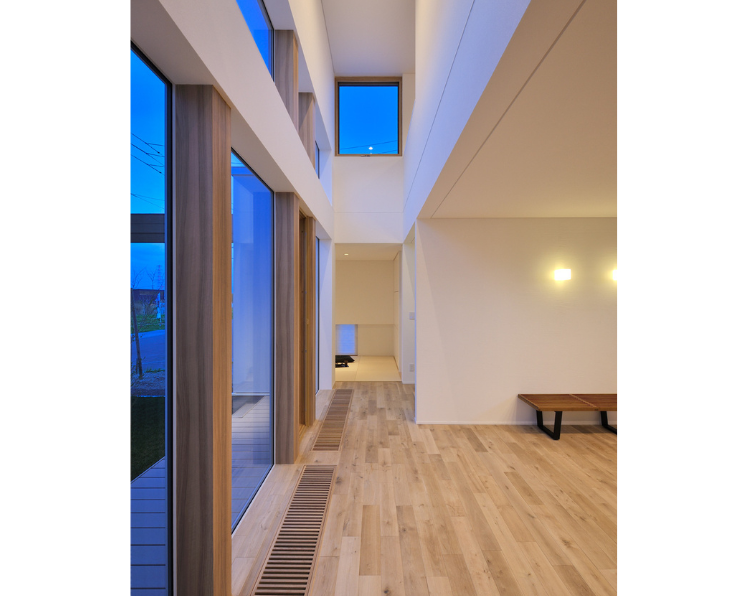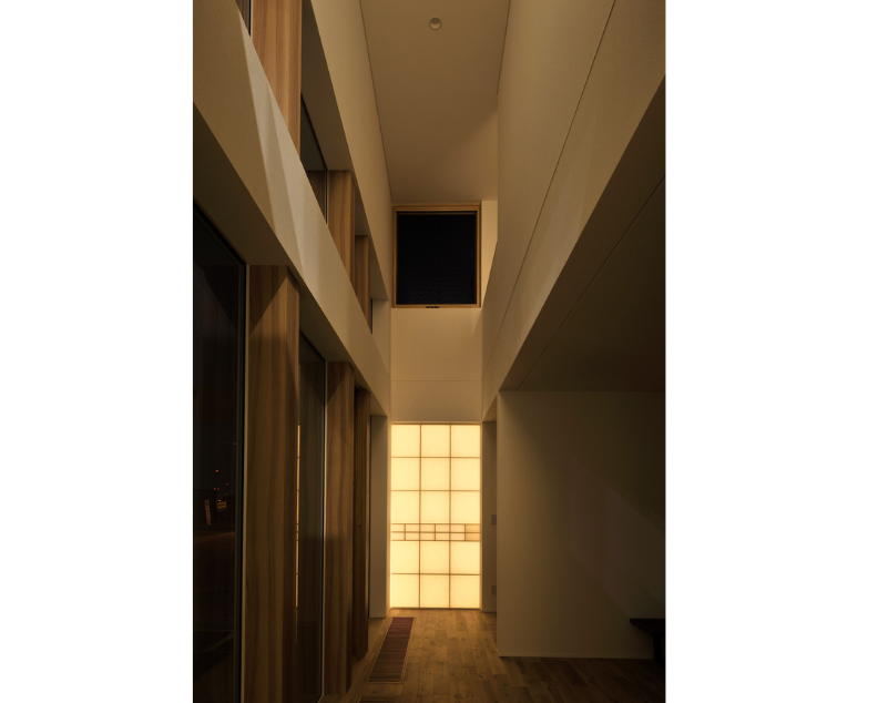 玄関ホールの大開口の窓や和室入口上の窓は黄金比を取り入れて設計で、整然とした美しさを感じます。襖は「太鼓襖」と呼ばれる障子張りを採用し、内部の光をやわらかく透けさせることで、コストを抑えながらも上質な雰囲気を生み出しました。