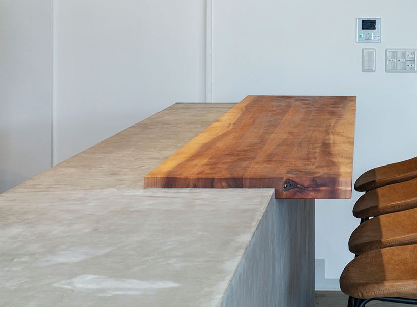 床はモルタル仕上げとし、カウンターには耐水性のあるモールテックスを採用。山桜の木材と組み合わせることで、木のぬくもりを引き立てながら異素材の調和を生み出します。住宅でも水まわりや造作家具に取り入れれば、デザイン性と機能性を両立できます。