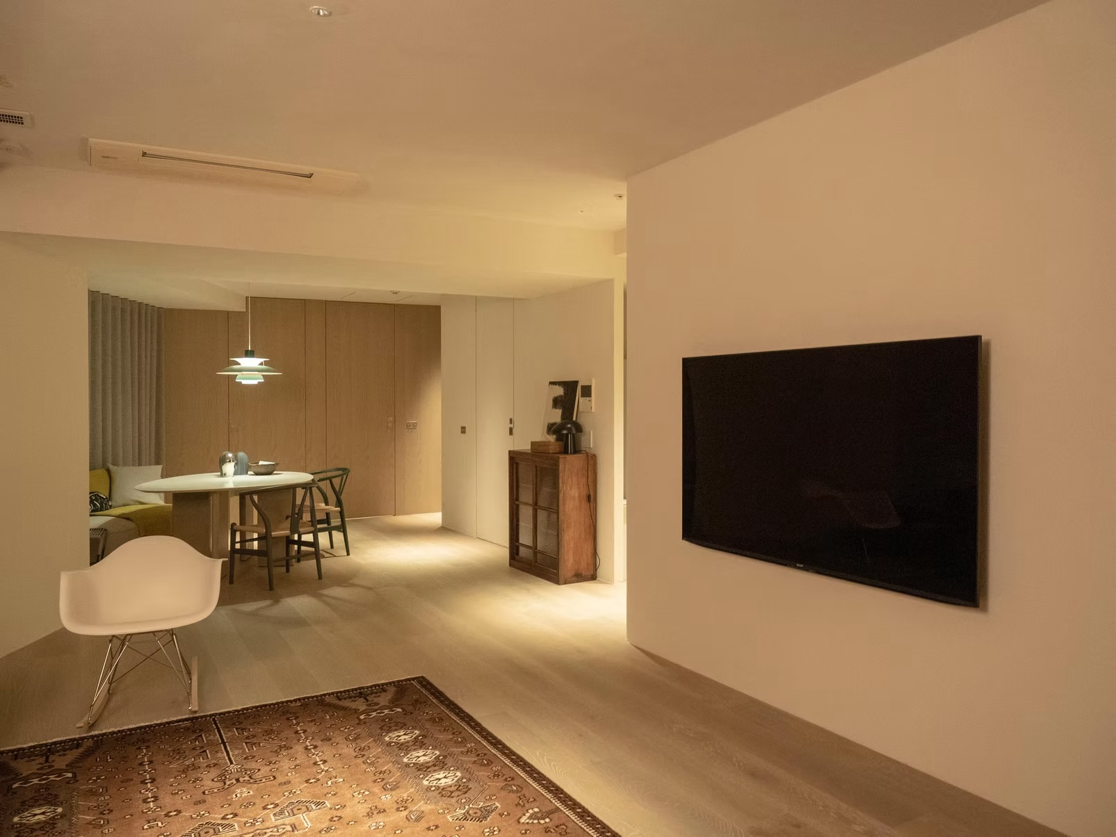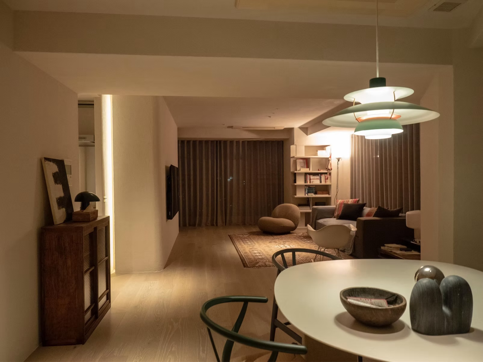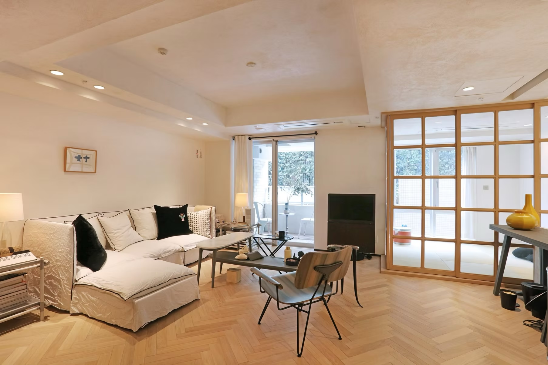 築25年ほどの都心マンションを舞台に、機能性と見た目をシンプルに更新した2LDK規模のリノベーション。既存の構造や間取りを極力活かしながら、床・壁・照明を刷新し、住まい全体をすっきりとした印象へと導いています。