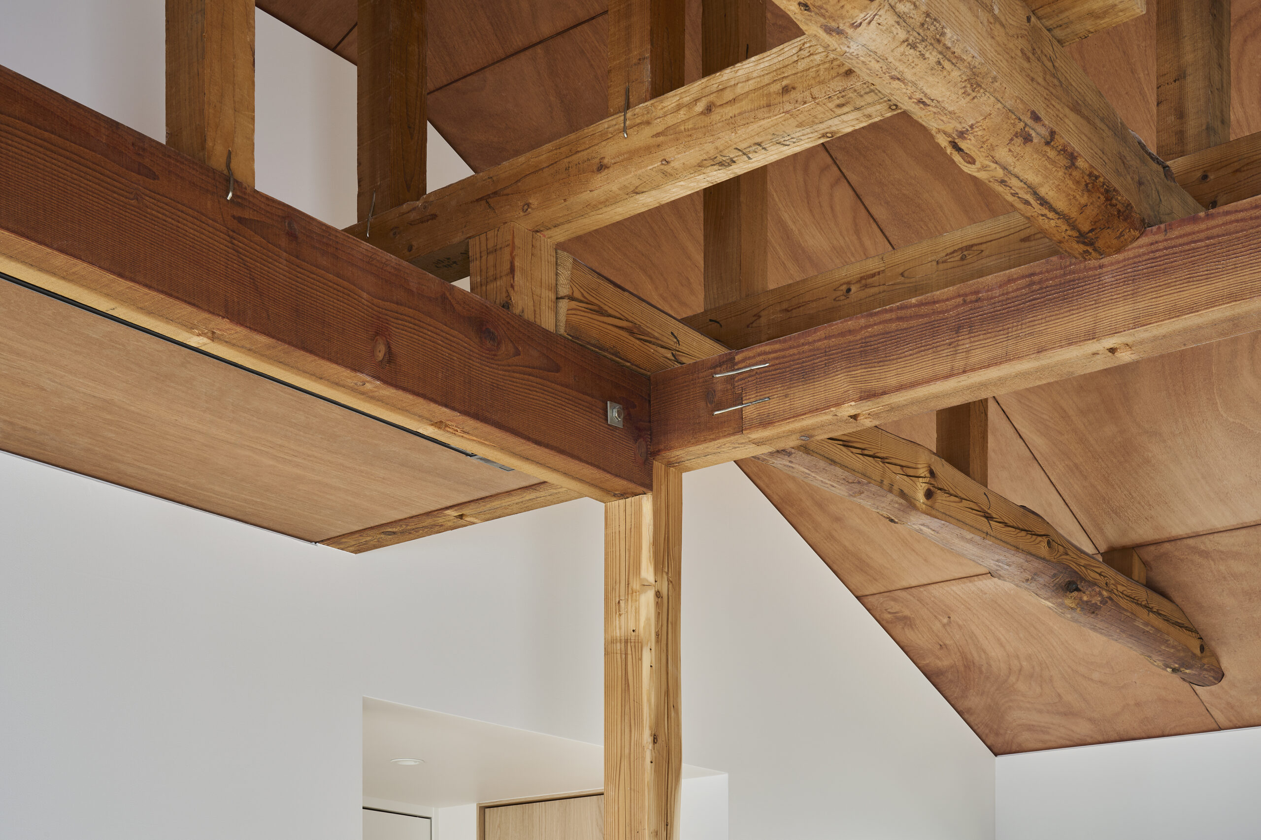 床にはお施主様が希望されたオーク材を採用。天井は梁を表しにし、仕上げにはラワンベニアを用いてオイル塗装で色を調合しました。この塗装作業はDIYでご家族も一緒に参加し、いくつかのパターンを試しながら「自分たちの色」をつくりあげています。手に入れやすい素材にひと手間を加えることで、新しい部分と古いものが心地よく調和する空間となりました。
