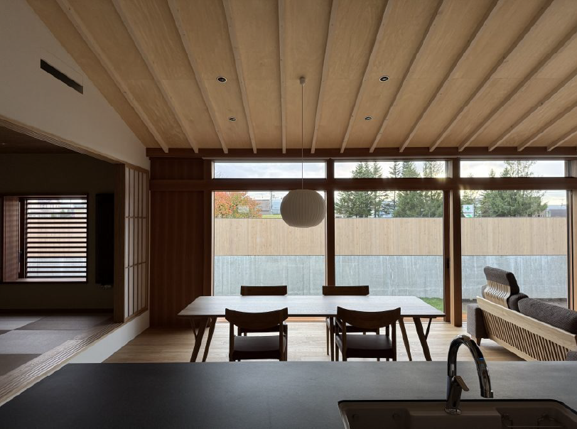 北海道札幌市。お施主さんご夫婦と3人のお子さんのために計画された平屋の住宅。 お施主さんの希望は、住戸棟と車庫棟を2つ並べた配置計画、風水に配慮した四角い間取り、そして南側に広がる公園の景色を取り込むことでした。