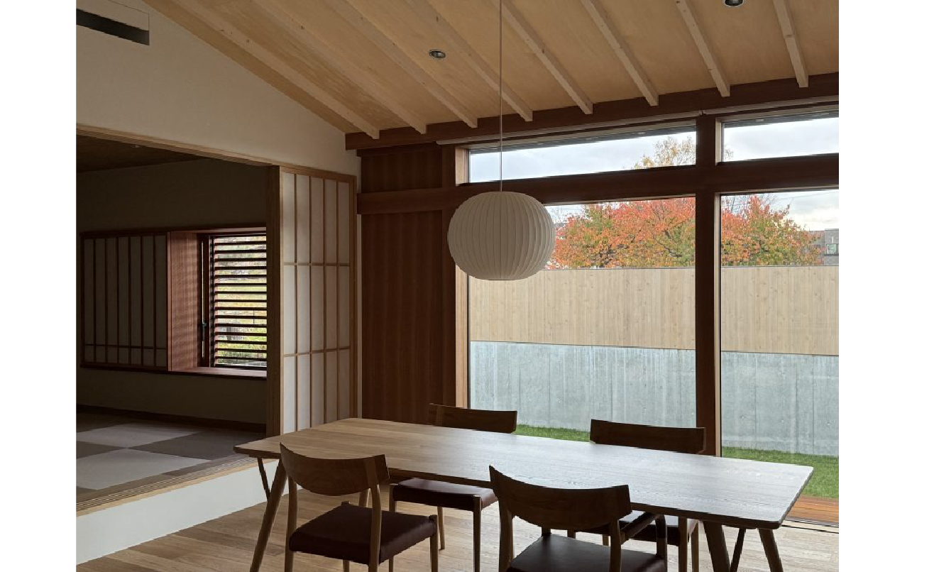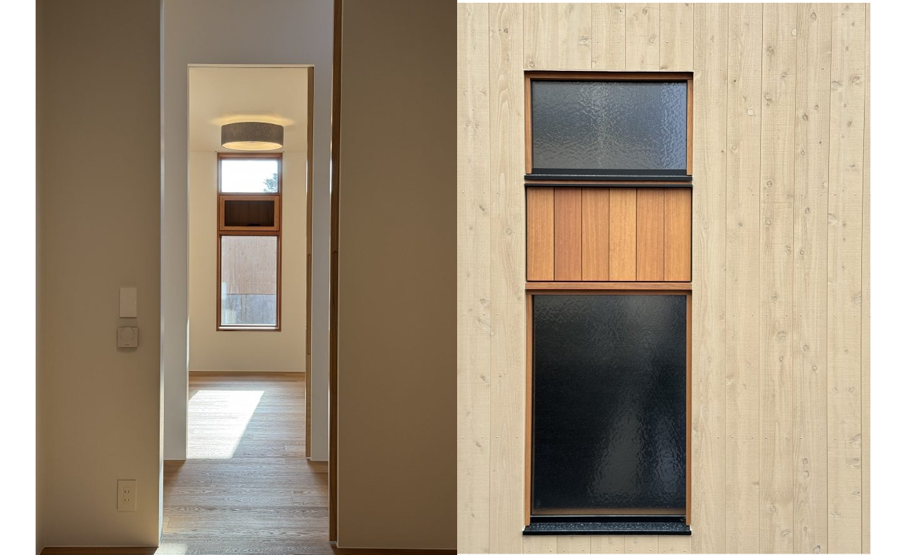 窓の位置とサイズは外装材の道南杉の板幅と割付で細かく決めています。桟の細さや横桟のラインは一つひとつ図面を描き込んで調整され、大工さんの高い精度が空間全体の美しさを支えています。