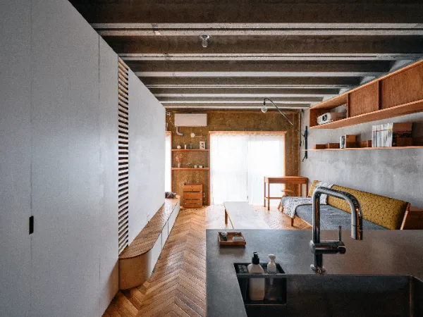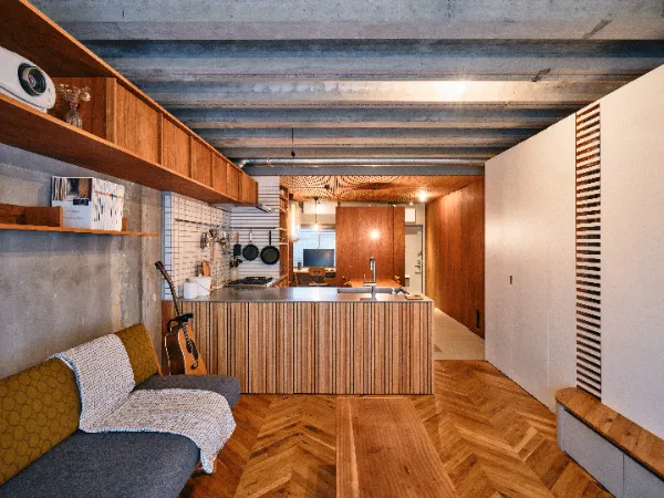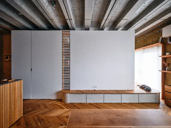 素材は合板を基本としながらも、天井のルーバーや壁の仕上げにピッチの違いをつけたり、タイルやコンクリートなど異素材を組み合わせたりすることで、雑貨や小物が無造作に置かれても自然と空間に馴染みます。さらに、家具や建具と壁仕上げのトーンを揃え、雑多な印象を抑えながら自由度の高い住まい方を実現しました。