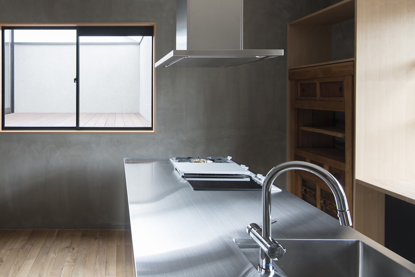 奥行き1mを確保した造作キッチンは、単なる作業場ではなく、家族や友人が集まり、多用途に使える余白を残した設計としました。収納や作業スペースをダイニング側・リビング側の両方から使えるデザインで、生活の中心となります。造作にすることでコストも調整。引き出し収納は最小限にとどめ、市販のかごやケースを自由に組み合わせて使えるようにすることで、ライフスタイルの変化にも柔軟に対応できるようにしました。