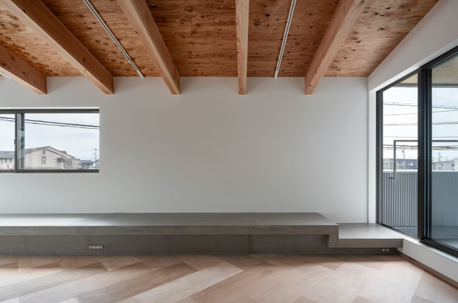 リビングの左側に設けた長いベンチは、ダイニングチェアやソファのように使えるのはもちろん、昼寝もできるなどフレキシブルな設えです。使い方を限定しないことで、暮らしに合わせて多様に対応できます。ベンチはフレキシブルボードというセメントボードを採用したことで、木造住宅では難しいコンクリートのような質感を実現し、空間にアクセントを与えています。