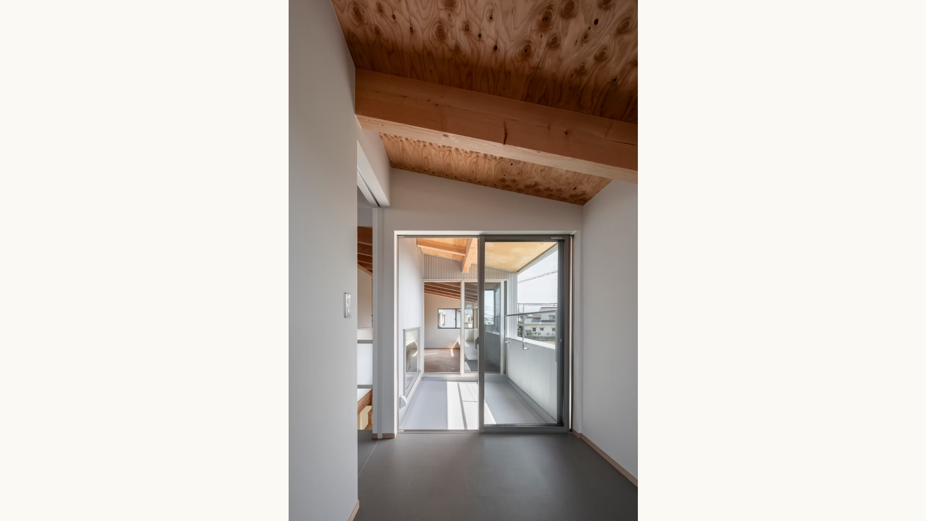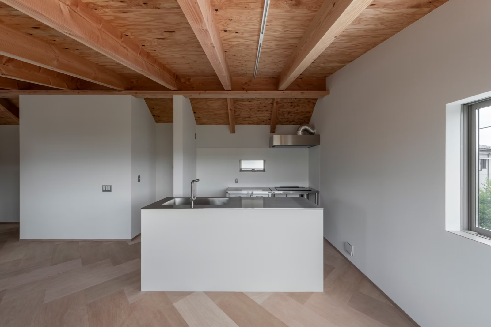暮らしの中心となるLDKは最上階に設けました。斜線制限の影響で高さに制約のある天井は、梁を表しにした勾配天井とし、できる限り高さを確保。限られた条件の中でも、開放感のあるのびやかな空間を作ります。
