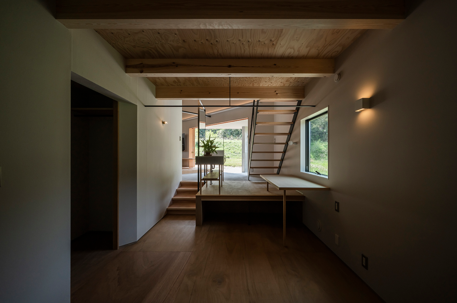 一段下がった寝室は小さな窓から光を絞り込み、洞窟のような落ち着いた雰囲気をつくります。一方で、一段上がったLDKには大きな開口を設け、開放感を。こだわりの木製の造作サッシは引き込み式にすることで外部に向かってフルオープンにできます。