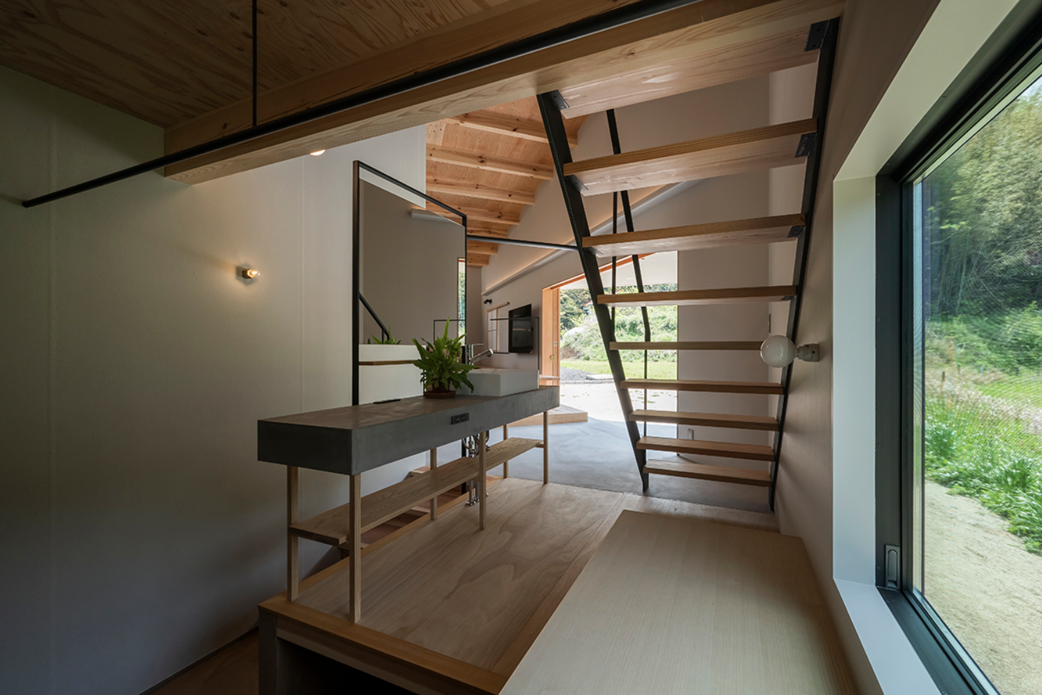 また、くの字に折れた空間の一角には洗面台を配置しました。一般的には脱衣室の中に収めることが多い洗面台ですが、この住まいではあえてLDKと寝室をつなぐ生活動線上に設置しています。中央に置くか端に寄せるかで、家全体の雰囲気や動線は大きく変わります。「暮らしの一部を隠さない」という考えのもと、洗面台は家具の一部としてデザイン。圧迫感を与えない細身のフォルムで、空間を区切る役割も担います。細い脚やフレームを用いることで軽やかさを際立たせ、オープンでありながら適度なメリハリを生み出しています。