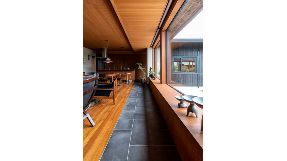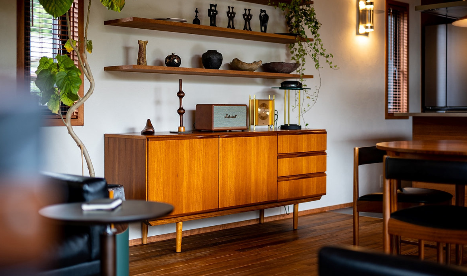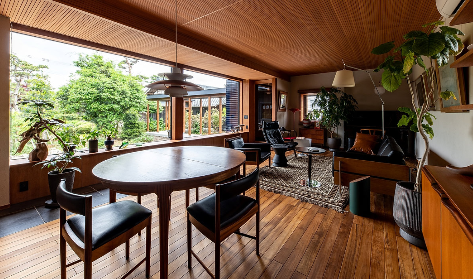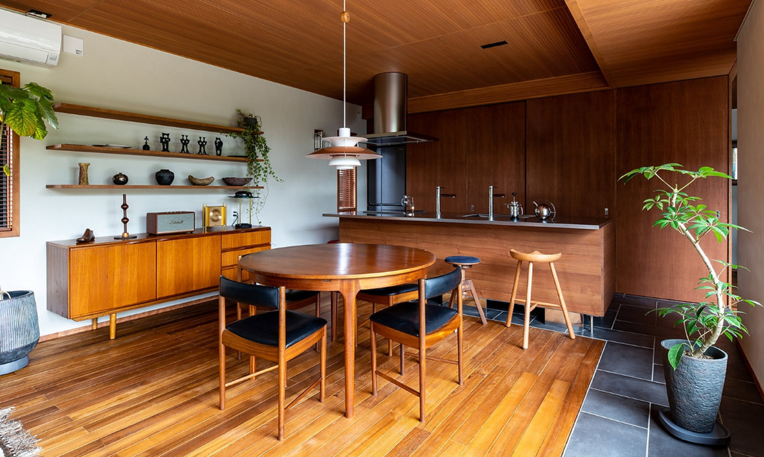 ビンテージ家具に合わせて、濃い色味のチークを採用。床と天井に濃い色を配置することで圧迫感が生まれないよう、奥行きや天井の高さ、幅のバランスを計算しています。