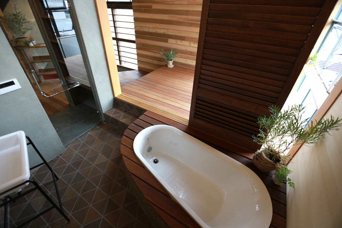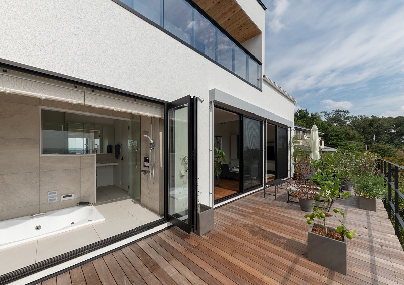 「お風呂から景色を楽しみたい。できれば外にも出られるようにしたい」というご主人の希望から、浴室も外に開き、デッキにつながる構成としました。