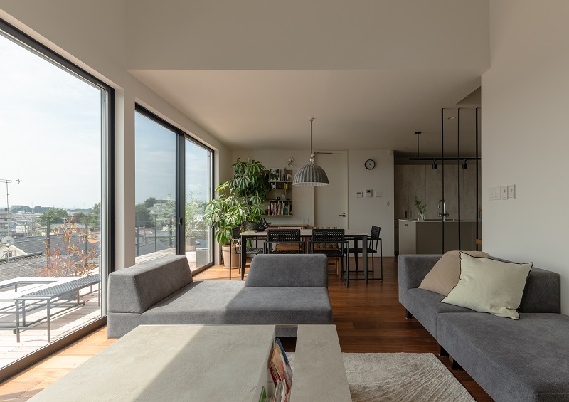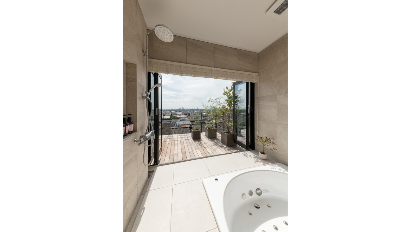 浴室はテラスを介して隣のリビングともつながっており、空間に連続性を生み出しています。