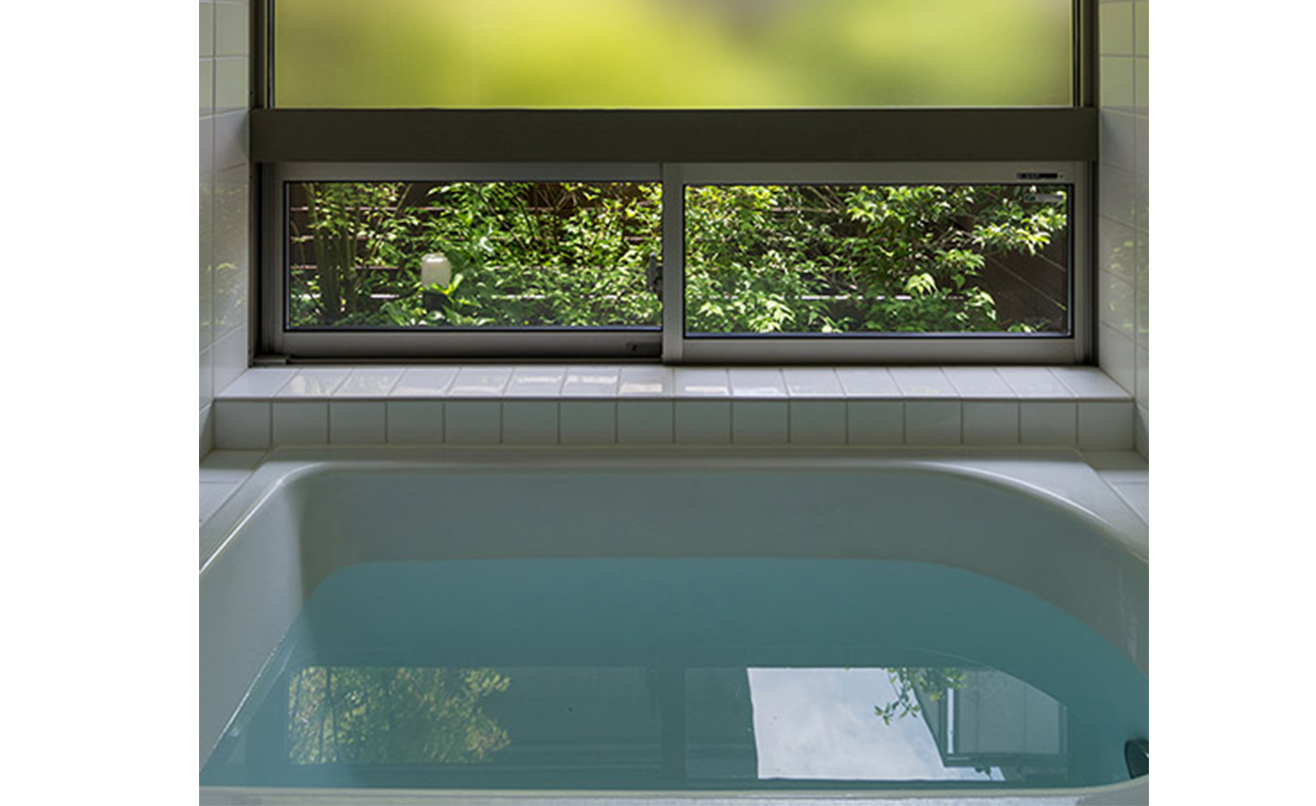 ピクチャーウィンドウや引き違い窓ではなく、すべて開放できるサッシを採用しました。浴槽は床に埋め込むタイプのものを採用。高台という立地上、外からの視線はほとんど気にならず、浴槽からは目の前に空が広がります。景色を独り占めする贅沢なひとときは、旅行先の宿で過ごしているかのような非日常を日常に取り込んでいます。