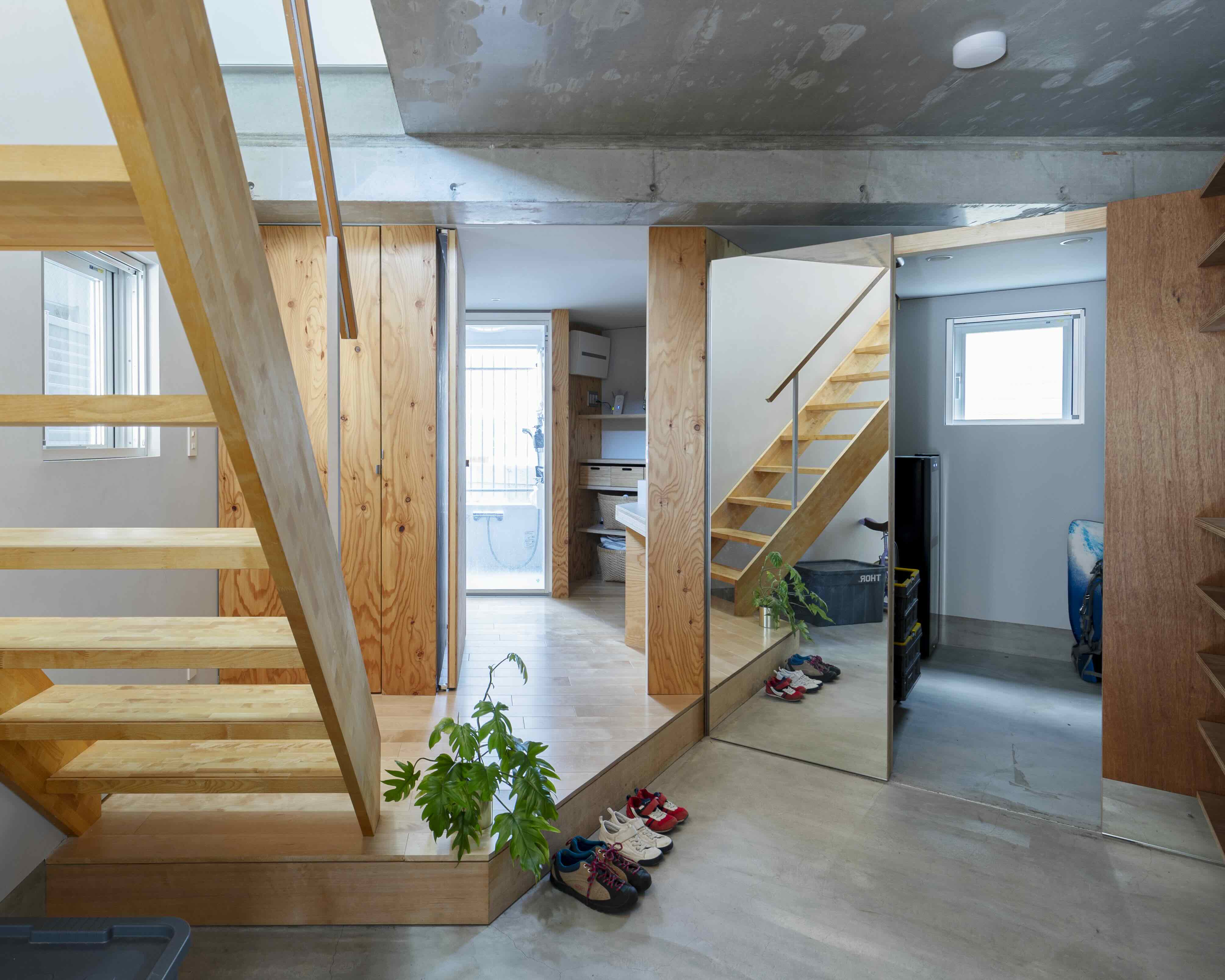 建物の中心には階段を据え、上下階を緩やかにつなぐ軸としました。玄関を入ると、土間と小上がりの2つのゾーンが現れ、この家の立体的な広がりを予感させます。1階にはキャンプ道具を収める土間収納を設け、趣味を暮らしに取り込む場としています。