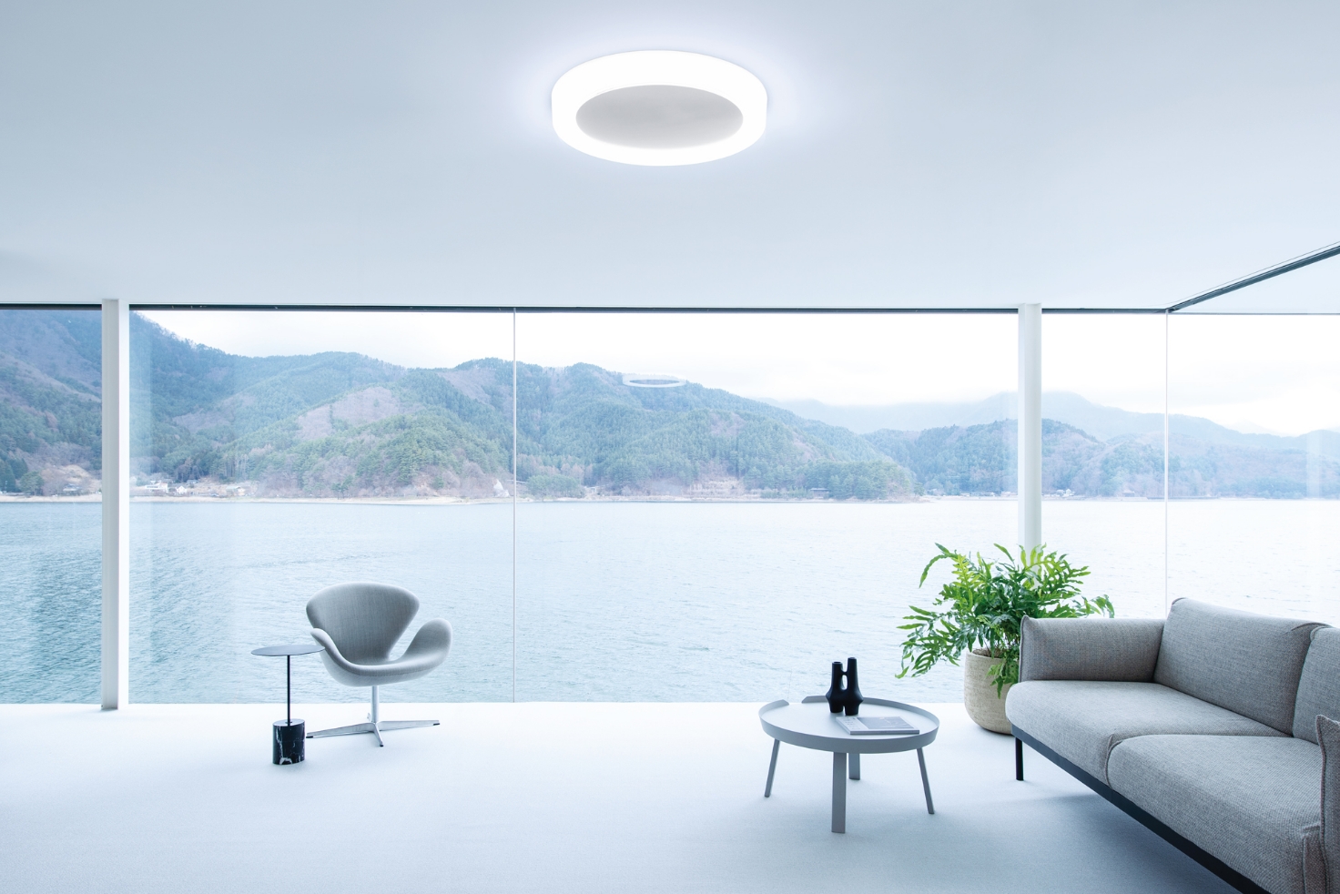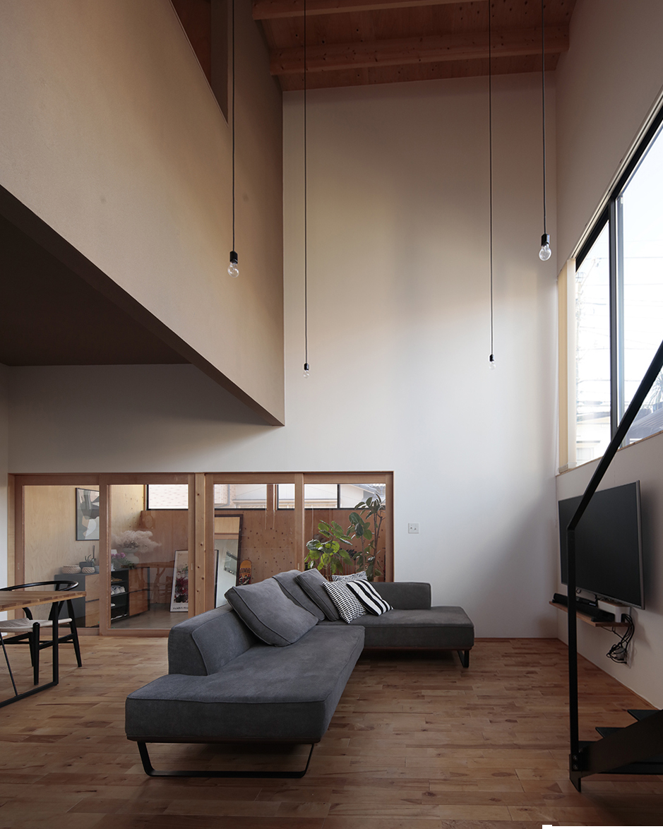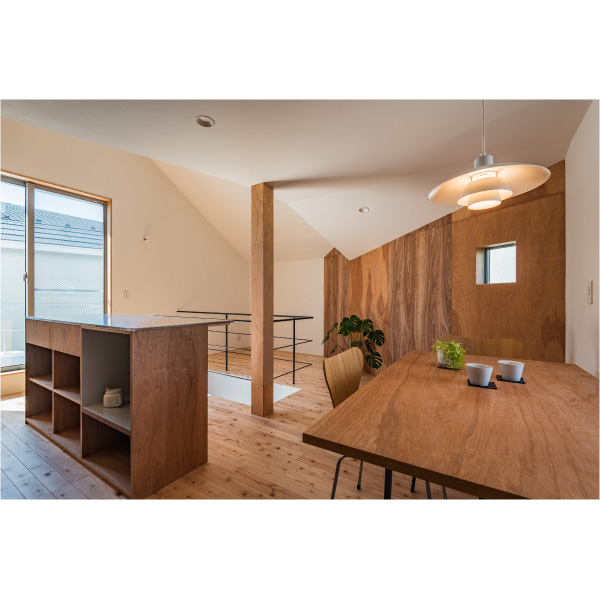敷地は五角形に近い変形地で、その形を生かして建物も敷地なりに計画。壁をすべて白で仕上げると単調になり狭さが強調されるため、一部にラワン合板を貼り、素材の表情をプラスしました。さらに天井には斜めのカットを入れることで、空間に動きを与えます。
