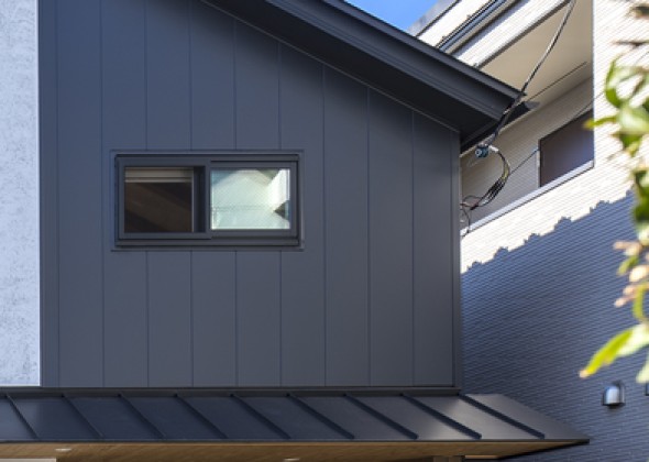 横に貼った白と縦に貼った黒のガルバリウム。この対角線上に配置したSP・ガルブライトという材料は、断熱材を兼ねた性能を持ちます。さらに屋根や床には吹き付けのアイシネンを使い、壁はアイシネンを吹き付けた上にガルブライトを貼る施工で、断熱性能を格段に高めました。