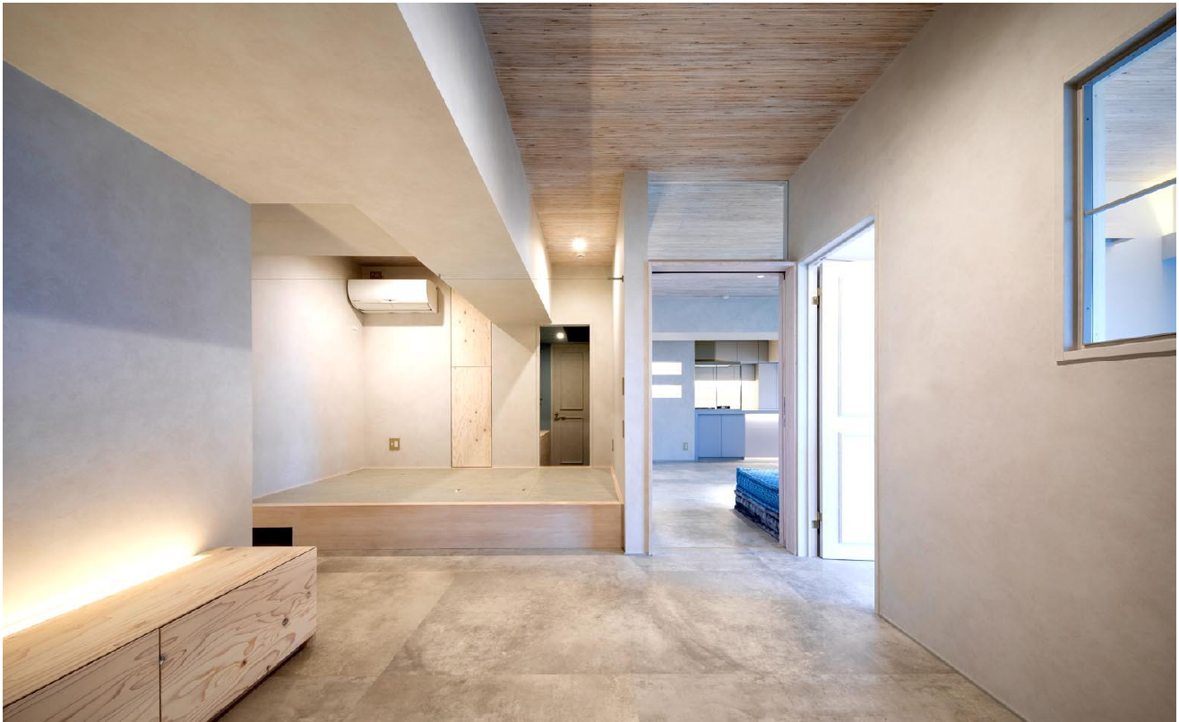 多くの部屋と長い廊下をもつ間取りを暮らしのリズムを感じられる構成へと見直し。SRC構造の大梁が生む高低差をあえて活かし、生活のシーンを数珠つなぎに連続させる“大回廊”として再構成しています。