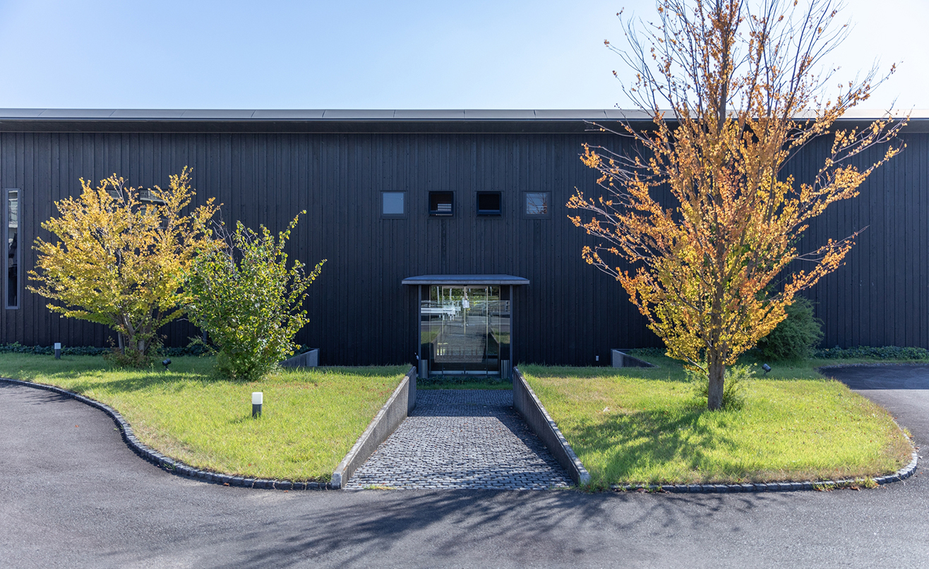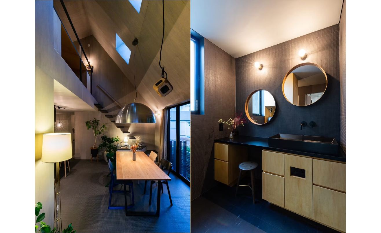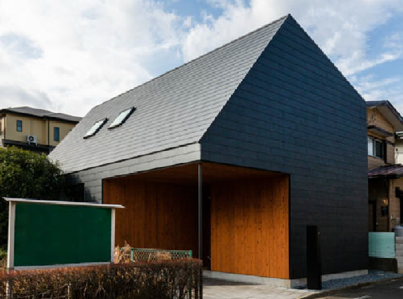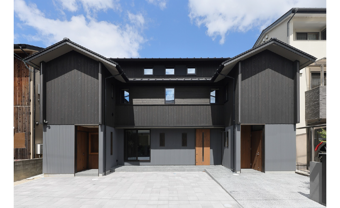 外観は黒い屋根と木の軒裏が対比する端正なフォルムで、内部はグレーの壁にブラックのキッチンと明るい木を組み合わせ、落ち着きの中に温もりが漂います。