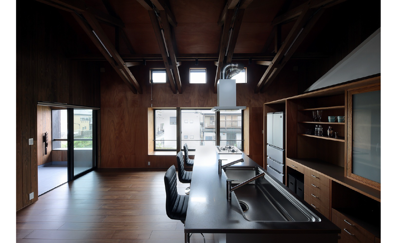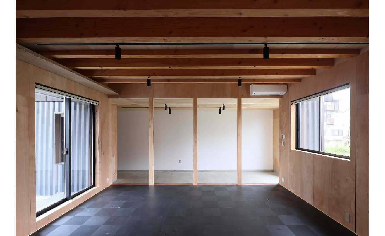 1階はラワンベニヤの壁と黒いPタイルの床、奥の土間はコンクリート基礎をそのまま仕上げとし、内部は仕上げを極力省き素材の素顔をそのまま見せています。
