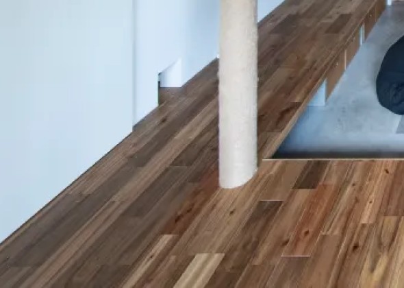 天井や建具にはラワンベニアを用い、木目のあたたかさと素朴な風合いを大切にしています。フローリングも無垢材を採用し、猫の爪あとがついても目立ちにくく、経年変化も楽しめる仕様です。