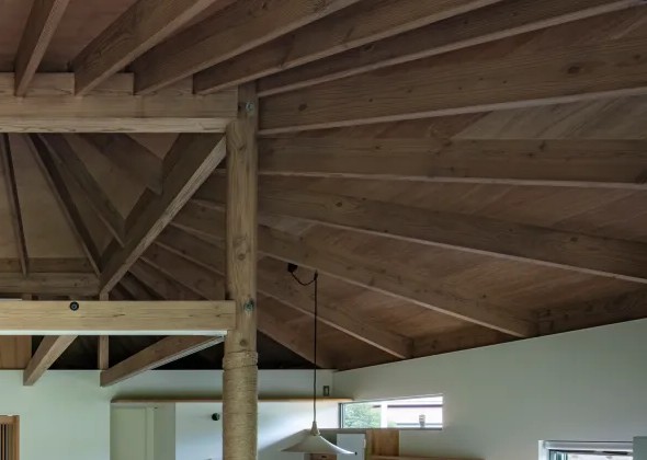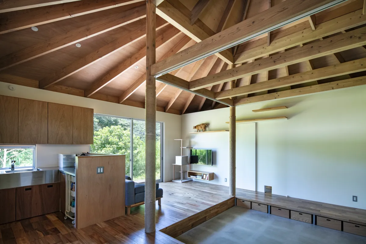 中央の柱は屋根を支える構造体でありながら、猫にとっての動線や遊び場としても活躍します。麻縄を巻いた柱を猫がよじ登り、梁の上を自由に歩き回る姿は日常の光景です。