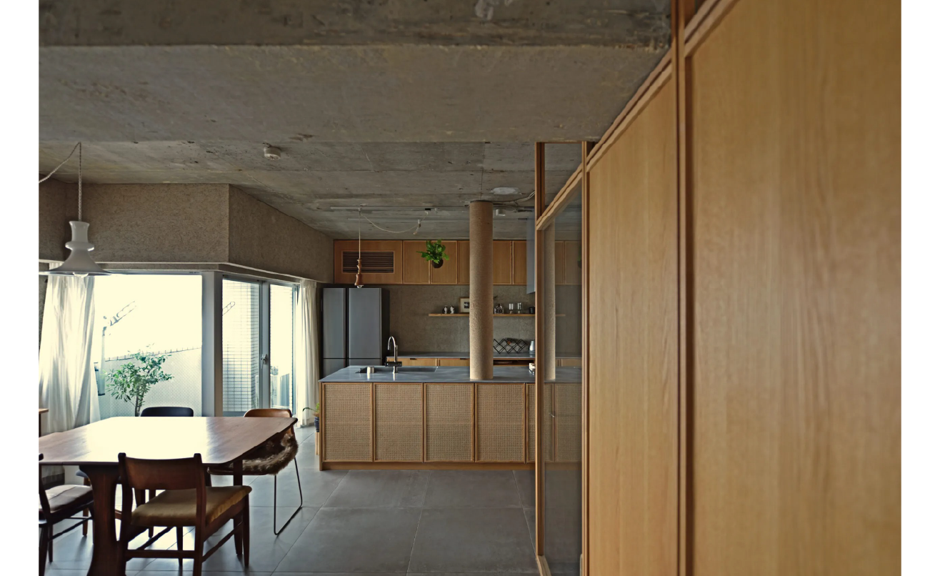 コンクリートと木の静かな対話の中に、光がゆっくりと広がる。キッチンを中心に食と暮らし、そして猫たちの気配が穏やかに混ざり合う住まいです。