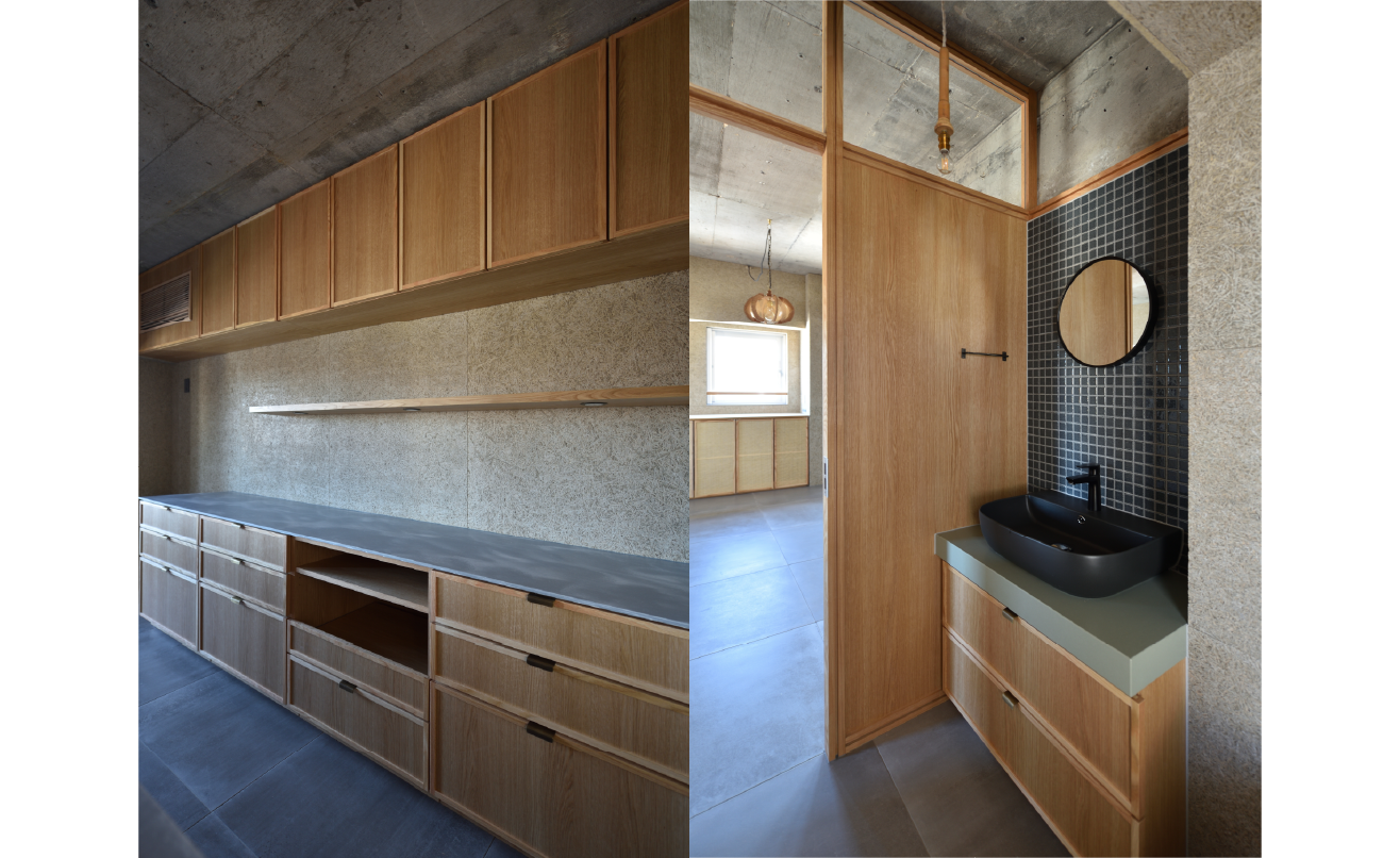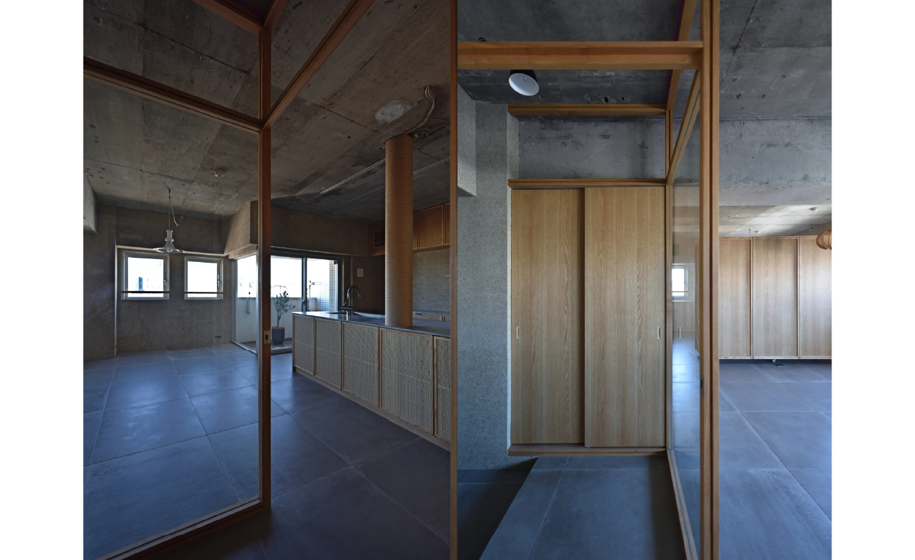 内装には構造体のコンクリートを現しとし、床には大判タイル、壁には木毛セメント板を採用。タモ材のフレームで構成された建具は、ガラスと木パネルを組み合わせ、見せる・隠すのバランスを取っています。