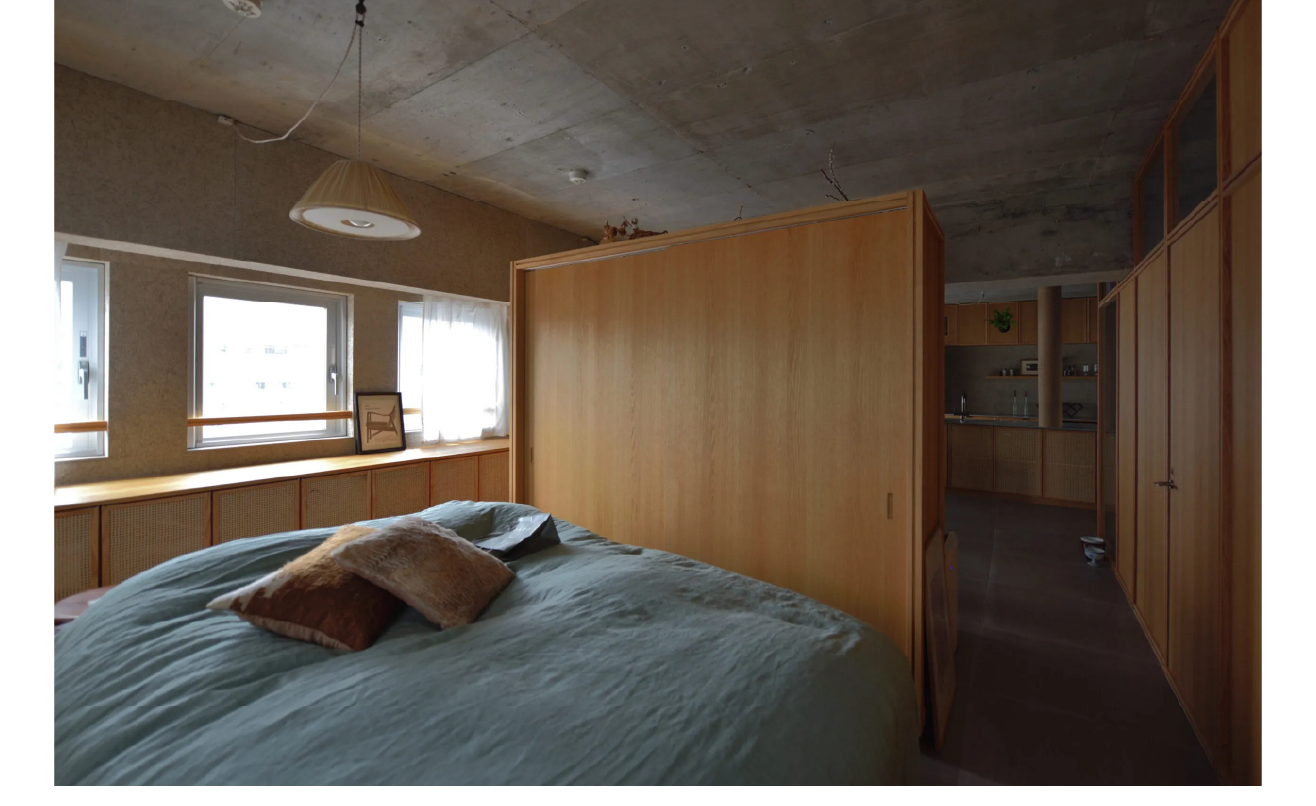 LDKと寝室がゆるやかに連続し、キャスター付きの家具によって自由に間取りを変えられる構成です。そして角部屋の利点である二面採光を活かし、視界の抜けを確保しています。