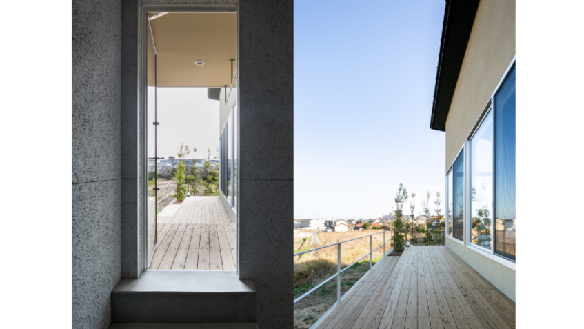 外に広がるウッドデッキは、窓から一段下げた場所に設けることでデッキが隠れ、田園風景を遮りません。風景がより美しく見えるよう、敷地の高低差を活かし、水平ラインを強く意識したデザインです。